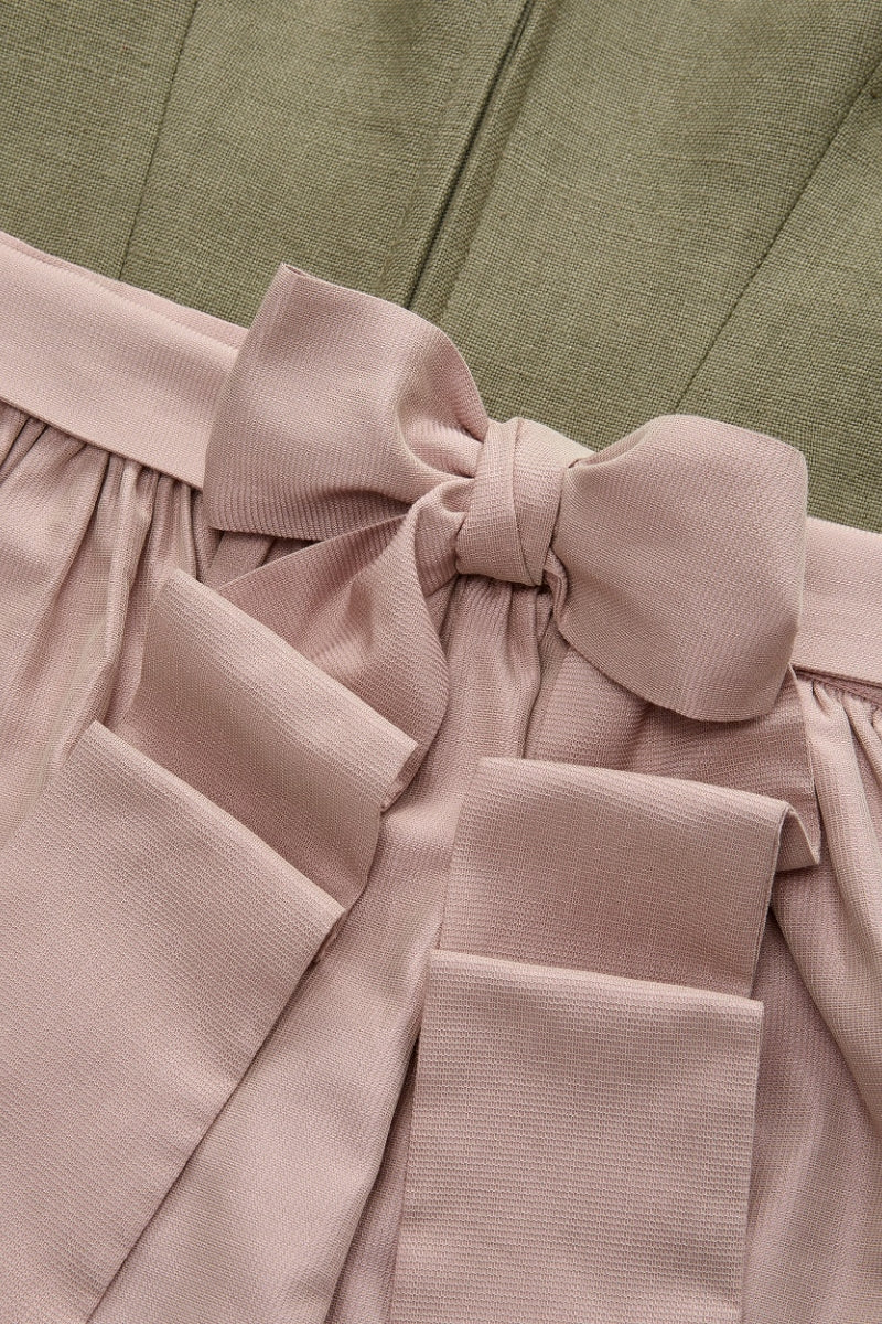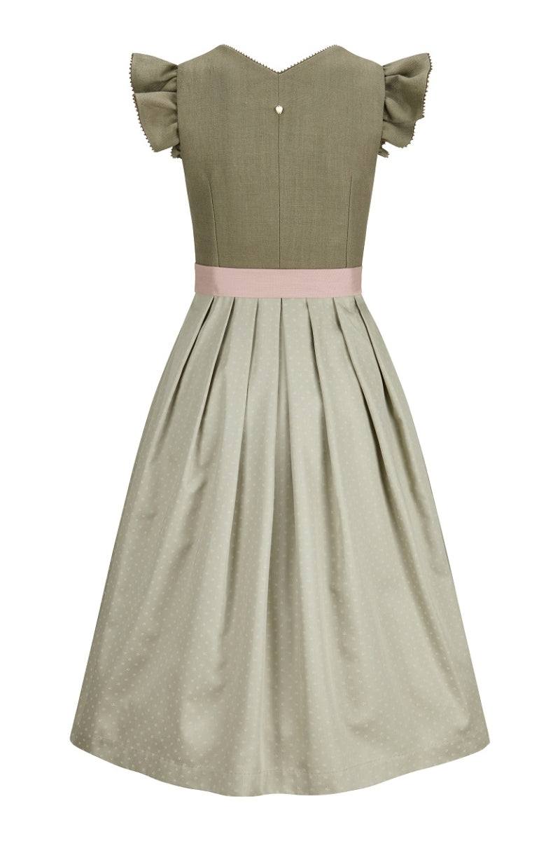 Die harmonisch abgestimmte Schürze in Altrosa setzt einen wunderschönen Kontrast zum olivfarbenen Kleid. Ihr sanfter Farbton unterstreicht die feminine Linie des Dirndls und sorgt für einen romantischen, stilvollen Gesamtlook.