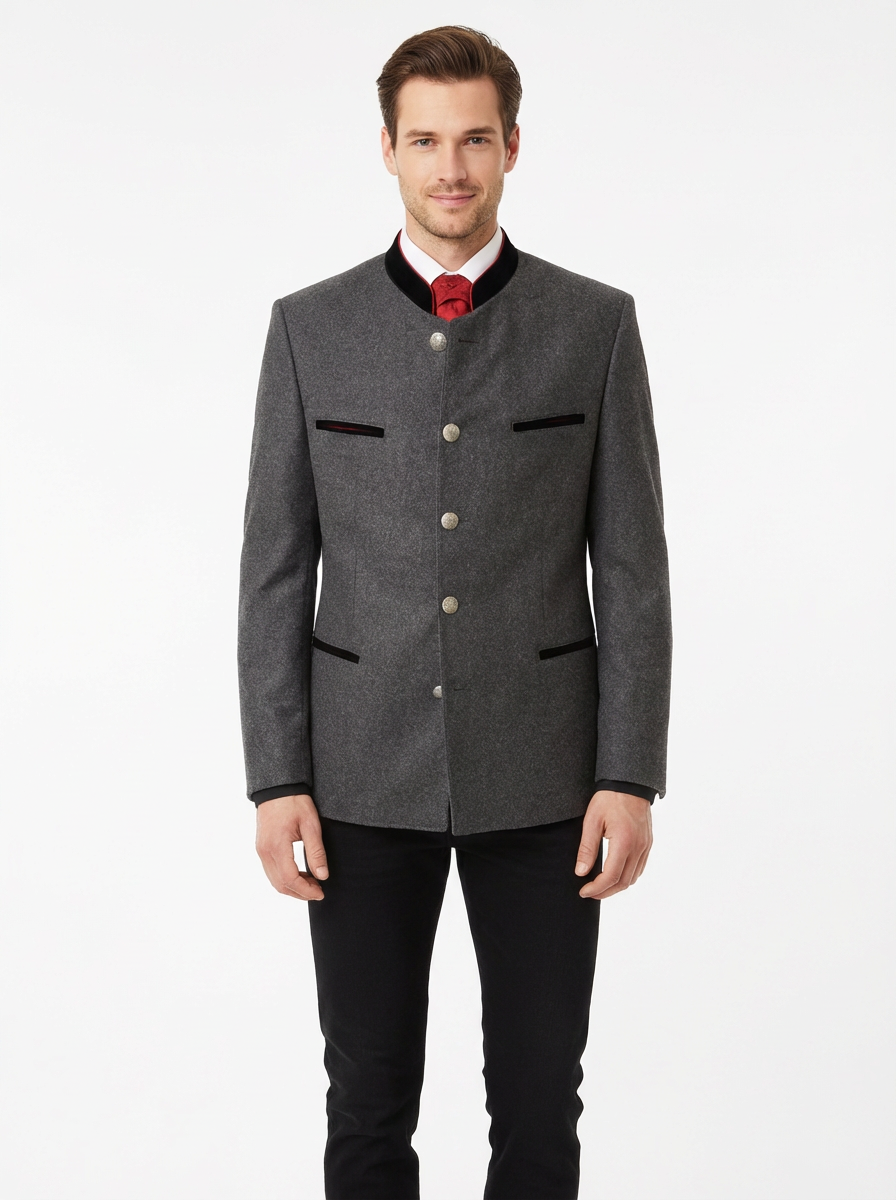 Das Sakko Feichsen von Lodenfrey vereint alpine Tradition mit zeitloser Eleganz. Inspiriert vom klassischen Steirer Sakko präsentiert es sich in edlem Grau und überzeugt durch liebevolle Details: feiner Samtbesatz, charakteristische Dragoner sowie hochwertig geprägte Metallknöpfe mit Adler-Motiv verleihen dem Sakko seinen authentischen Charakter. Ein stilvolles Modell für anspruchsvolle Auftritte mit Tradition.